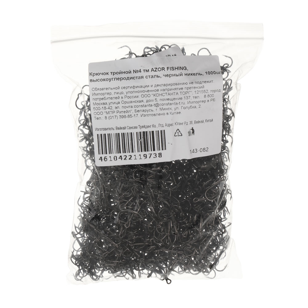 Тройные крючки AZOR FISHING №4 предназначены для рыбалки и обеспечивают надёжное зацепление при ловле различных видов рыбы. Изготовлены из прочной высокоуглеродистой стали, что гарантирует устойчивость к нагрузкам, изломам и долговечность при активном использовании. Покрытие чёрный никель защищает крючки от коррозии и придаёт им привлекательный матовый оттенок. Комплект из 1000 штук идеально подойдёт как для профессиональных рыболовов, так и для любителей, обеспечивая достаточный запас для долгих рыбалок.