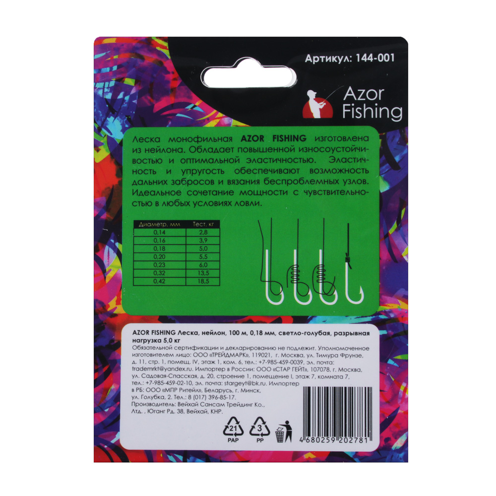 Нейлоновая леска Azor Fishing «Окунь, Судак» диаметром 0,18 мм выдерживает рыбу весом до 5 кг. Хороший вариант для речек богатых корягами и водорослями. Обладает отменными амортизирующими свойствами. При сильном рывке вместо того, чтобы оборваться, она растягивается. Как результат — рыбак не потеряет снасти и улов. Леска из нейлона не скручивается, не помнит прошлых намоток. Имеет средний уровень прочности. При забросе не путается. Светло-голубая нить не заметная в воде, хороша в тандеме со спиннингом и поплавочной удочкой.
