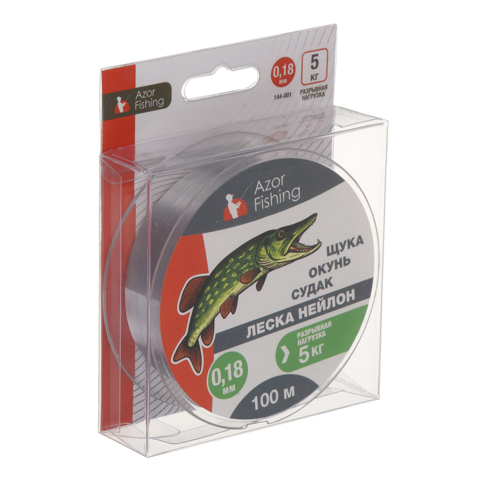 Нейлоновая леска Azor Fishing «Окунь, Судак» диаметром 0,18 мм выдерживает рыбу весом до 5 кг. Хороший вариант для речек богатых корягами и водорослями. Обладает отменными амортизирующими свойствами. При сильном рывке вместо того, чтобы оборваться, она растягивается. Как результат — рыбак не потеряет снасти и улов. Леска из нейлона не скручивается, не помнит прошлых намоток. Имеет средний уровень прочности. При забросе не путается. Светло-голубая нить не заметная в воде, хороша в тандеме со спиннингом и поплавочной удочкой.