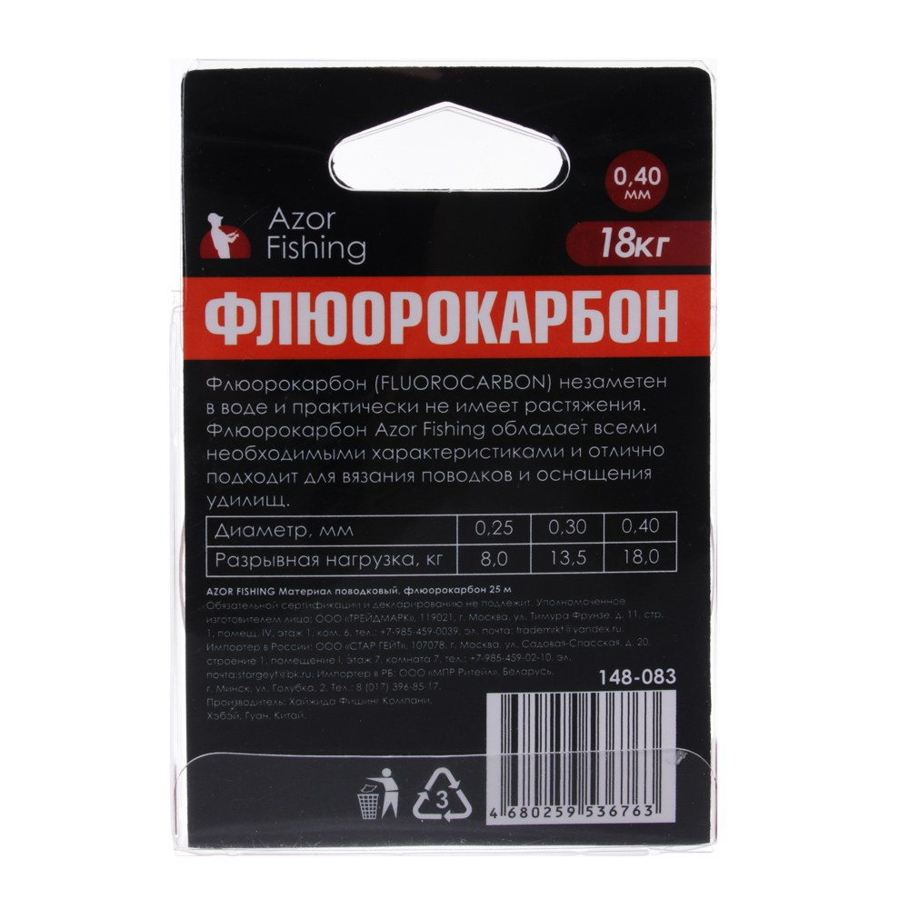 Флюрокарбоновая леска используется рыбаками в качестве поводков для создания надежных рыболовных конструкций. Поводковый материал Azor Fishing имеет низкий коэффициент преломления света, а потому незаметен в водных просторах. Высокая устойчивость к искривлению и деформации. Применяется в фидерной, спиннинговой и поплавочной ловле. Диаметр нити — 0,25 мм.