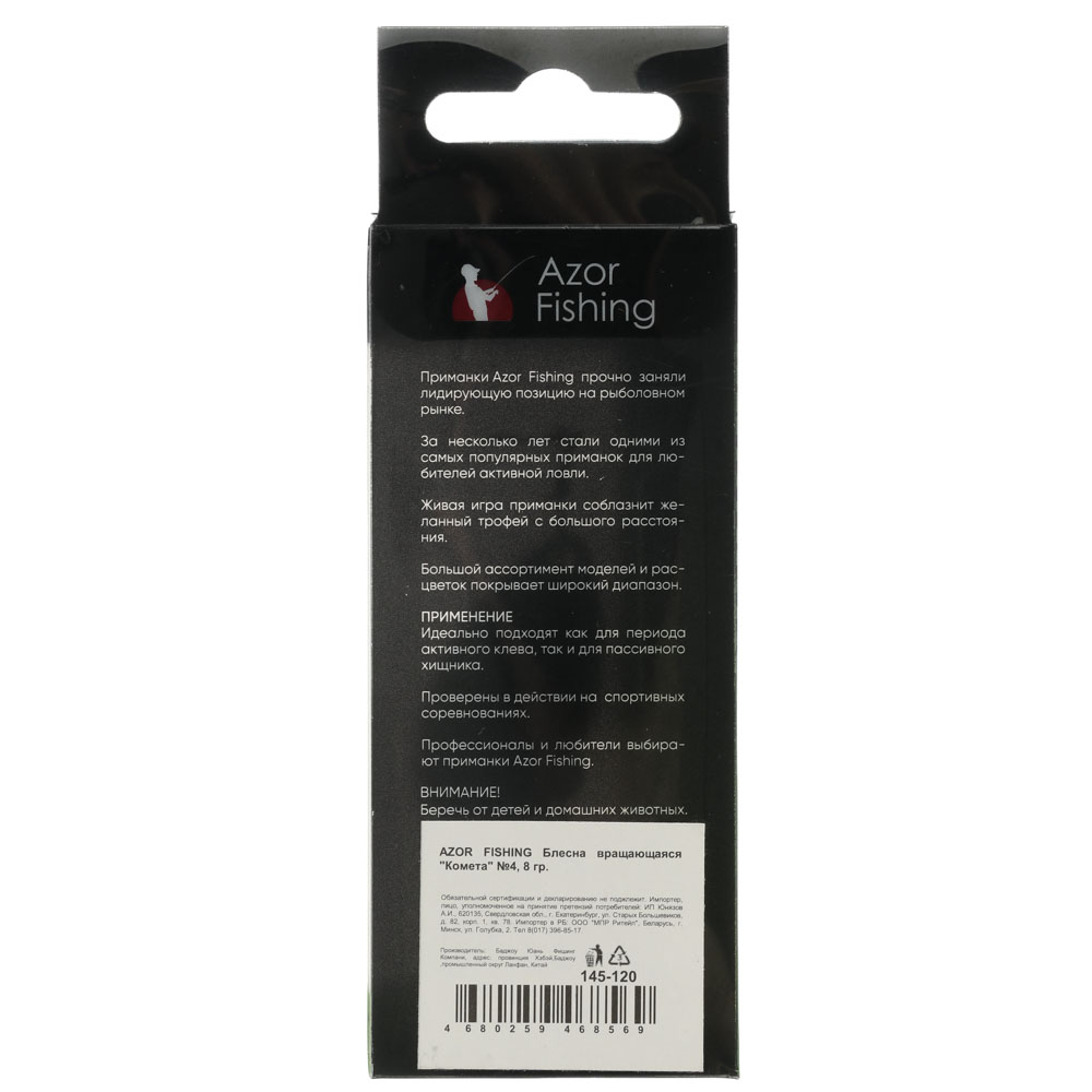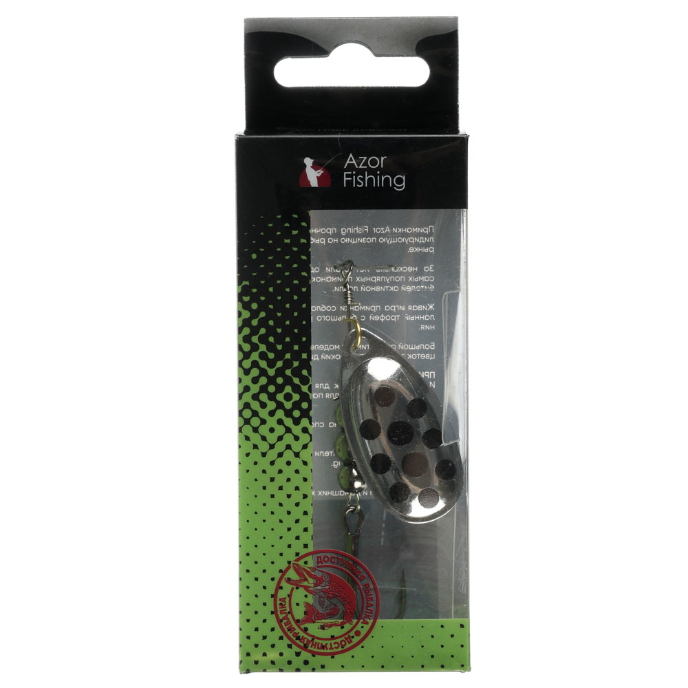 Блесна вертушка Azor Fishing №4 с тройником предназначена для ловли хищной рыбы весом до двух килограмм. Приманка овальной формы имеет большое сопротивление. Обеспечивая сильное эхо в водном пространстве, она привлекает пресноводных хищников с дальних расстояний. Помимо размера и цвета на результат рыбалки влияет частота вращения блесны. Окунь реагирует на высокочастотные и быстрые снасти, щука — на малочастотные и медленные. Вес изделия — 18 грамм.