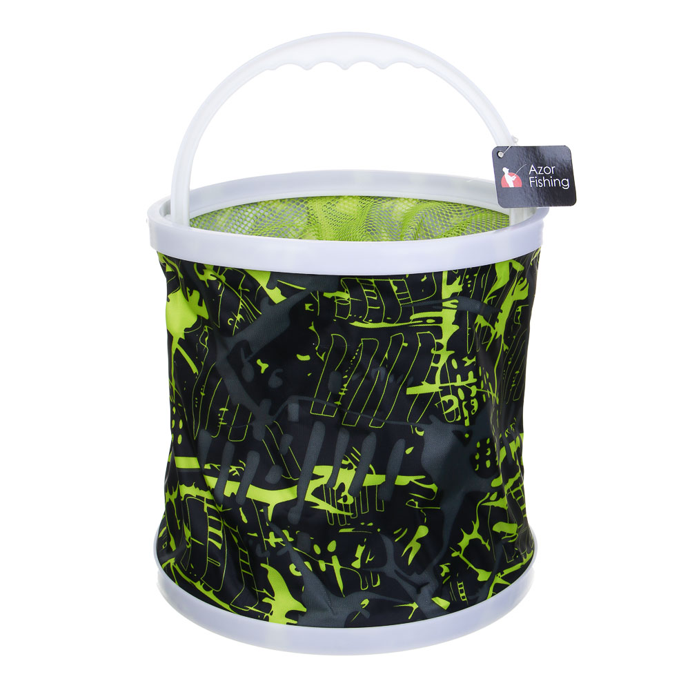 Ведро для рыбалки с сеткой AZOR FISHING, объем 11 л, представляет собой водонепроницаемую складную сумку в форме ведра с ручкой. Имеет пластиковое основание, которое придает ему устойчивости, а также оснащено сеткой с ремешком-утяжкой, которая выполняет функцию крышки. Может использоваться для различных целей: для замешивания прикорма, переноски воды, хранения и транспортировки пойманной рыбы. Легкий вес и компактная конструкция делают ведро комфортным для транспортировки.