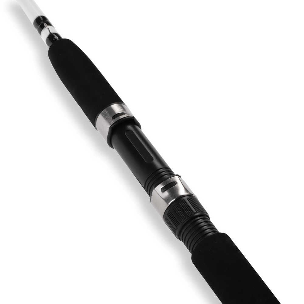 Мощное удилище с усиленными кольцами с не винтовым металлическим соединителем колен. Бланк полнотелый, изготовлен из эпоксидной смолы, что делает удилище несколько тяжелым, но очень прочным. Подходит для ловли крупной рыбы, в том числе сома, а так же для отвесной ловли на пилкеры весом до 250гр. Отлично себя зарекомендовал при троллинговой ловле.