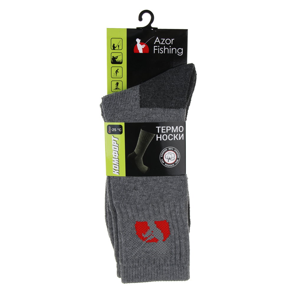 Мягкие и, действительно, теплые термоноски "Комфорт" от Azor Fishing, которые идеально подойдут для рыбалки, охоты, спорта и ежедневной носки. Специальная вязка обеспечивает идеальное прилегание и не позволяет носку сползать. В составе материала использовано сочетание хлопка и полиэстера, благодаря чему, теплый воздух не уходит наружу, а создает теплую прослойку между ногой и носком, не позволяя холодному воздуху проникать внутрь. Особенная структура волокна быстро впитывает и выводит наружу влагу, оставляя ноги сухими и теплыми. Также необходимо отметить высокую износостойкость. Термоноски не теряют своих качеств в течение долгого времени. Они не растягиваются и не садятся.